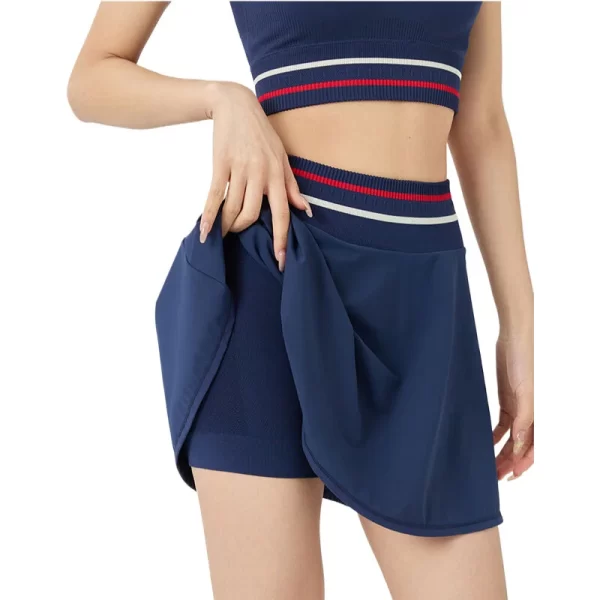 Elevate your game with this chic tennis set! The top and skirt combo features bold color-block stripes for a vibrant, youthful look, while the high-waist skirt and supportive top create a slimming silhouette. Built-in padding, anti-roll edges, and breathable fabrics ensure comfort and confidence on the court.